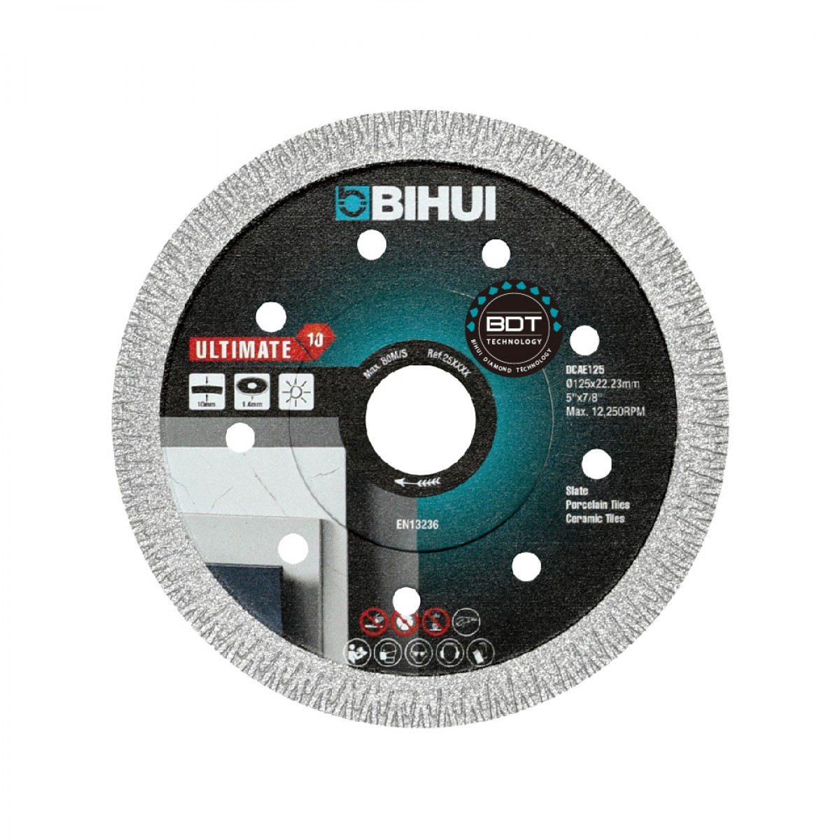 Диск BIHUI Ultimate DCAE125 має високу концентрацію алмазного зерна, що прикріплене до корпусу методом вакуумної пайки. Ця технологія забезпечує надійне, хімічне зчеплення алмазів з основою, що в рази збільшує ресурс диска порівняно зі звичайними спеченими дисками.