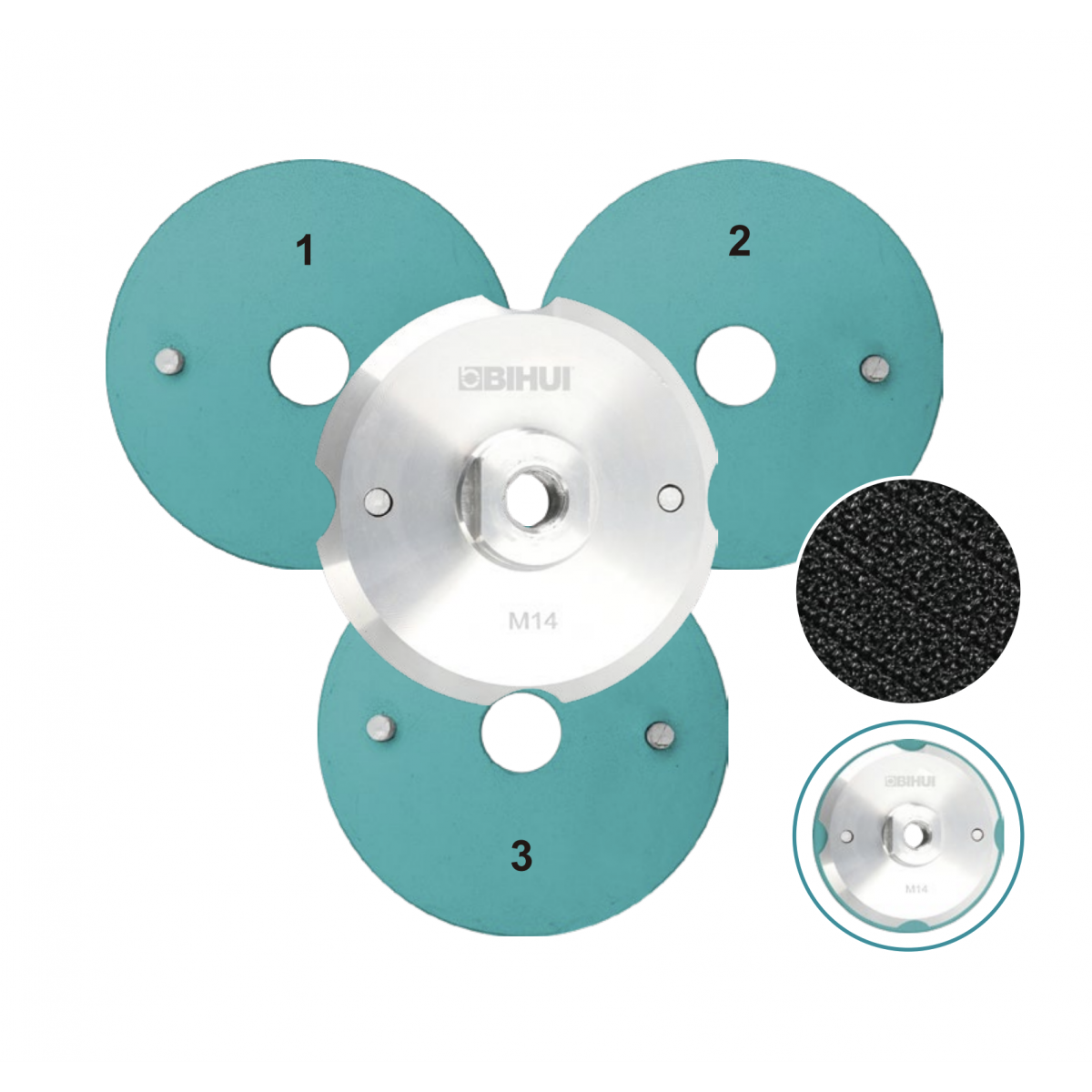 Даний комплект забезпечує максимальну ефективність завдяки одному центральному алюмінієвому адаптеру та трьом окремим металевим робочим платформам із липучкою. Це дозволяє майстру підготувати три різні шліфувальні диски заздалегідь (наприклад, P30, P60, P120) і миттєво перемикатися між ними.